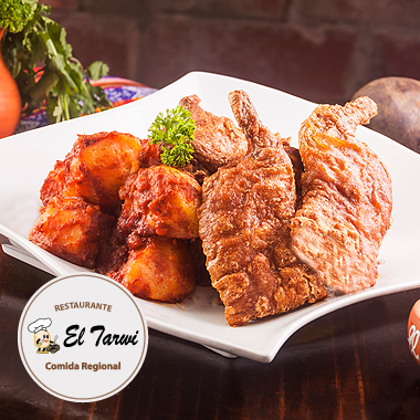 Plato estrella del Tarwi; riquisimo cuy frito y crocante acompañado de un picante de papas. (aji panca y mirasol)