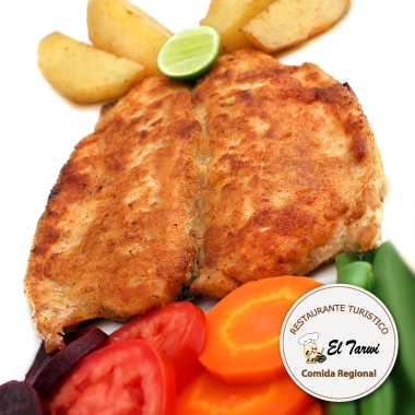 Filete de trucha entera, sazonada con una salsa de crema de ajos y el secreto del Cheff, se acompaña con papa dorada y ensalada